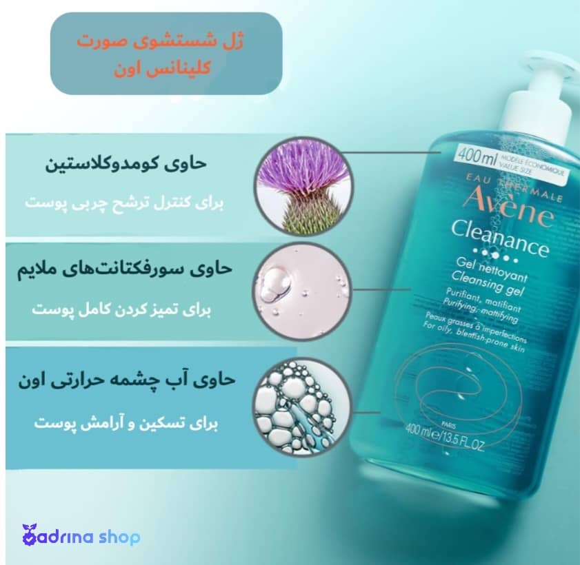 ژل شستشوی صورت 400 میل اون | Avene: دارای خاصیت آنتی باکتریال و ضد التهاب میباشد. و قادر است با کنترل سلول های مولد چربی، میزان ترشح چربی پوست را تنظیم نماید.