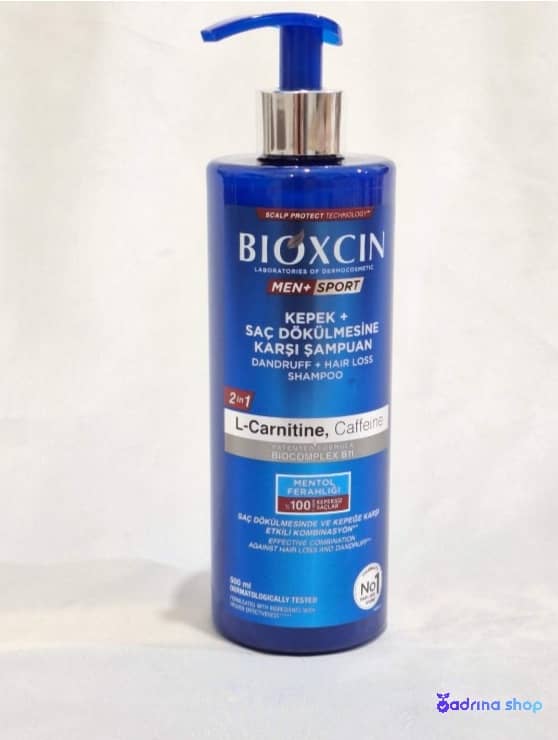 شامپو بیوکسین ضد شوره و ضد ریزش مردانه 2in1 حاوی کافئین و ال کارنیتین حجم 500 میل از سری محصولات بیوکسین BIOXCIN برای درمان شوره سر.