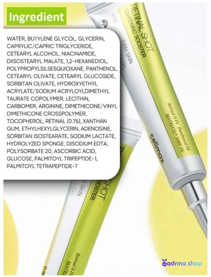 کرم ضدچروک رتینول شات سلیمکس (Celimax The Vita-A Retinal Shot Tightening Booster)، یک درمان تخصصی برای جوانسازی پوست است که با فرمولاسیون پیشرفته حاوی رتینال خالص (شکل فعالتر و ملایمتر رتینول) به کاهش خطوط ریز، چینوچروکهای عمیق و افتادگی پوست کمک میکند. این محصول با ترکیب ویتامین A، نیاسینامید و ترکیبات آبرسان قوی، بافت پوست را بازسازی کرده، رنگ پوست را یکنواخت میسازد و به مرور، استحکام و شفافیت طبیعی آن را بازمیگرداند.کرم رتینول شات سلیمکس بافتی سبک دارد و بدون ایجاد خشکی یا تحریک، برای استفادهی شبانه مناسب است.