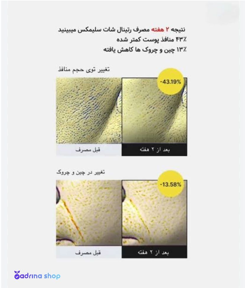 استفاده مداوم از این محصول میتواند به روشنتر شدن رنگ پوست، یکنواختی بافت و جلوگیری از پیری زودرس کمک کند.کرم رتینال شات از برند سلیمکس یک تقویت کننده قوی و تخصصی است که با ترکیبی از رتینول و ویتامینهای مغذی پوست، به بهبود الاستیسیته، کاهش چین و چروک و تنگ کردن منافذ کمک میکند.