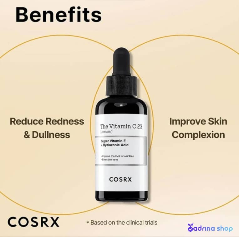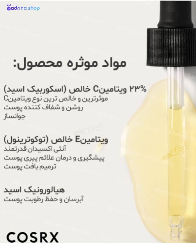 سرم ویتامین سی Cosrx:حاوی اسید ال اسکوربیک به عنوان یکی از بهترین فرم های ویتامین C است. این ماده یک آنتی اکسیدان قوی است که به محافظت از پوست در برابر عوامل استرس زای محیطی و رادیکال های آزاد کمک می کند و در عین حال رنگ پوست را روشن و یکنواخت می کند.