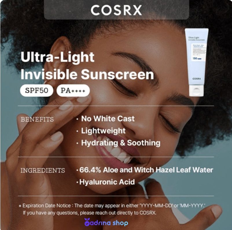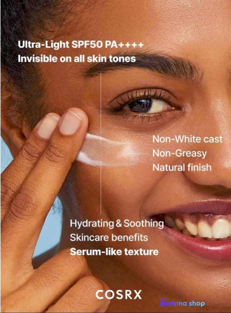 این محصول بدون چربی و چسبندگی است، بنابراین قبل از آرایش نیز قابل استفاده است.کوزارکس با محصولات پوستی کره ای همواره بر استفاده از مواد دوستدار پوست و عاری از هرگونه آزمایش روی حیوانات تأکید دارد.برای محافظت مؤثر، کرم ضد آفتاب سبک cosrx را قبل از قرارگیری در معرض نور آفتاب بمالید و برای حفظ محافظت، به طور مکرر به ویژه پس از تعرق، شنا یا استفاده از حوله آن را دوباره بزنید.