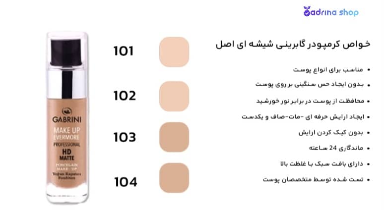 کرم پودر شیشه ای گابرینی طرح HD مات یکی از محصولات آرایش صورت از برند گابرینی (Gabrini) است که در زمینه تولید محصولات آرایشی و بهداشتی فعالیت دارد. این کرم پودر به طور خاص طراحی شده تا پوششی مات و طبیعی روی پوست ایجاد کند و برای استفاده روزمره یا آرایش های حرفه ای مناسب باشد . این کرم پودر در رنگ های مختلفی ارائه می شود تا برای تناژهای پوستی متنوع مناسب باشد. برای گرفتن بهترین نتیجه، بهتر است برای خرید کرم پودر گابرینی شیشه ای رنگ مناسب با پوست خود را انتخاب کنید.