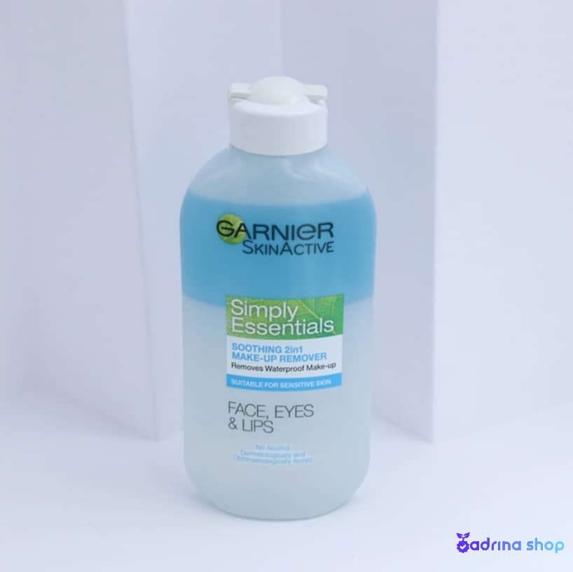 آرایش پاک کن دو فاز گارنیر مدل Simply Essentials 2in1:از دو فاز متفاوت تشکیل شده است، یک فاز روغنی آن مواد آرایشی را به طور کامل در خود حل می کند و فاز آب آن که پاک کننده می باشد و مواد شیمیایی را از روی پوست تمیز می کند.