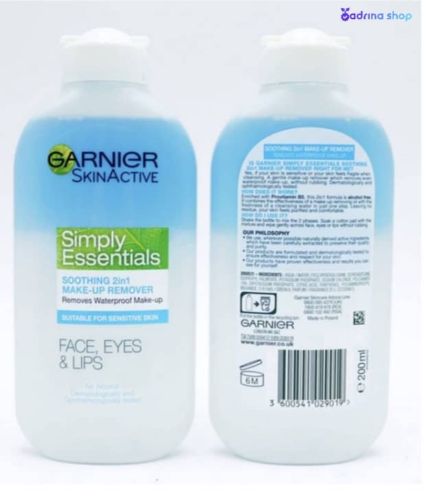پاک کننده دوفاز گارنیر:برای پاک کردن آرایش چشم و لب نیز ایمن است و باعث سوزش یا قرمزی چشمها نمیشود. ترکیبات آرامشبخش آن از تحریکات پوستی جلوگیری کرده و پوست را بهطور مؤثر آبرسانی میکند.