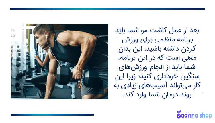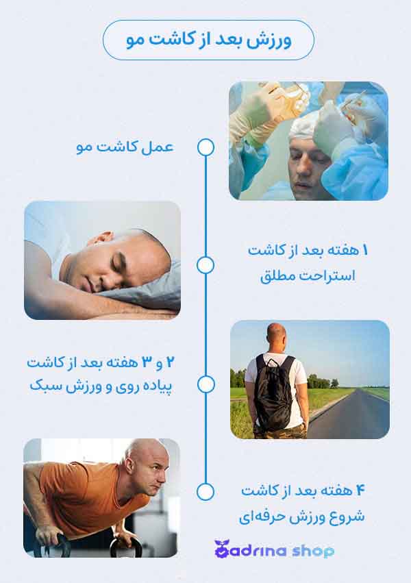 از تمرینات سنگین و شدید ورزشی باید 40 روز از عمل کاشت مو بگذرد و بعد از گذشت 7 روز از کاشت مو باید ورزش کردن را شروع کرد، ورزش های سبکی مانند پیاده روی انجام داد. ولی برای انجام ان باید حتما با پزشک معالج خود در ارتباط باشید. برای پیوند مو که فولیکول های مو سالم هستند موها را از پشت گردن یا قسمت مختلف بدن به قسمت های موی سر که در حال ریزش خواهند بود پیوند می زنیم.