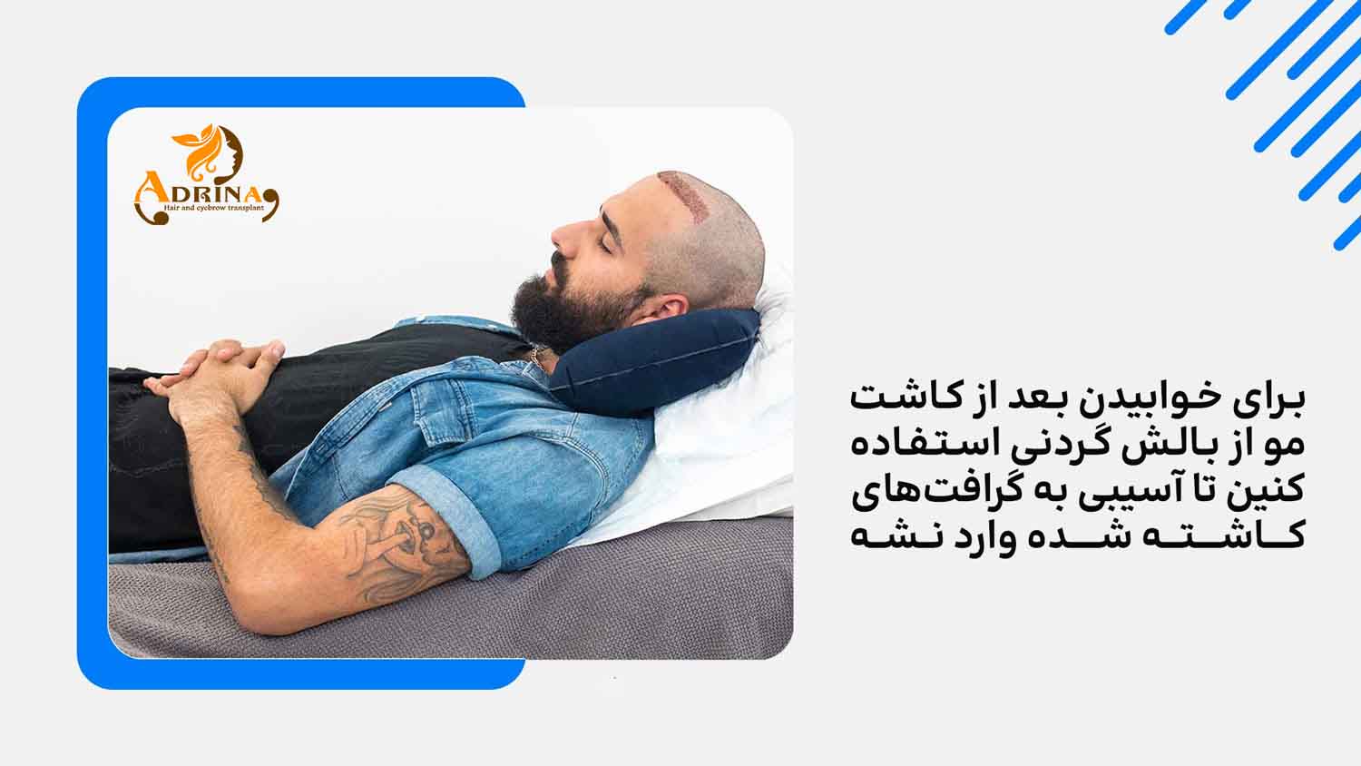 – نحوه خوابیدن بعد از کاشت: تا سه روز بعد از عمل شبها به پشت (کمر) بخوابید و زیر سر دو عدد بالش قرار دهید و یا از بالشهای مخصوص پشت گردن استفاده کنید تا تورم سر کاهش یابد و گرافت های مو روی سطوح کشیده نشوند.