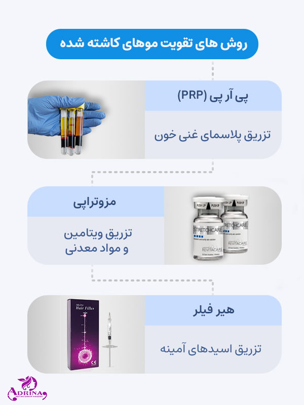 - مزوتراپی: درمانهای مزوتراپی که با تزریق مواد مغذی مستقیماً به فولیکولهای مو، به بهبود و تقویت آنها کمک میکنند.