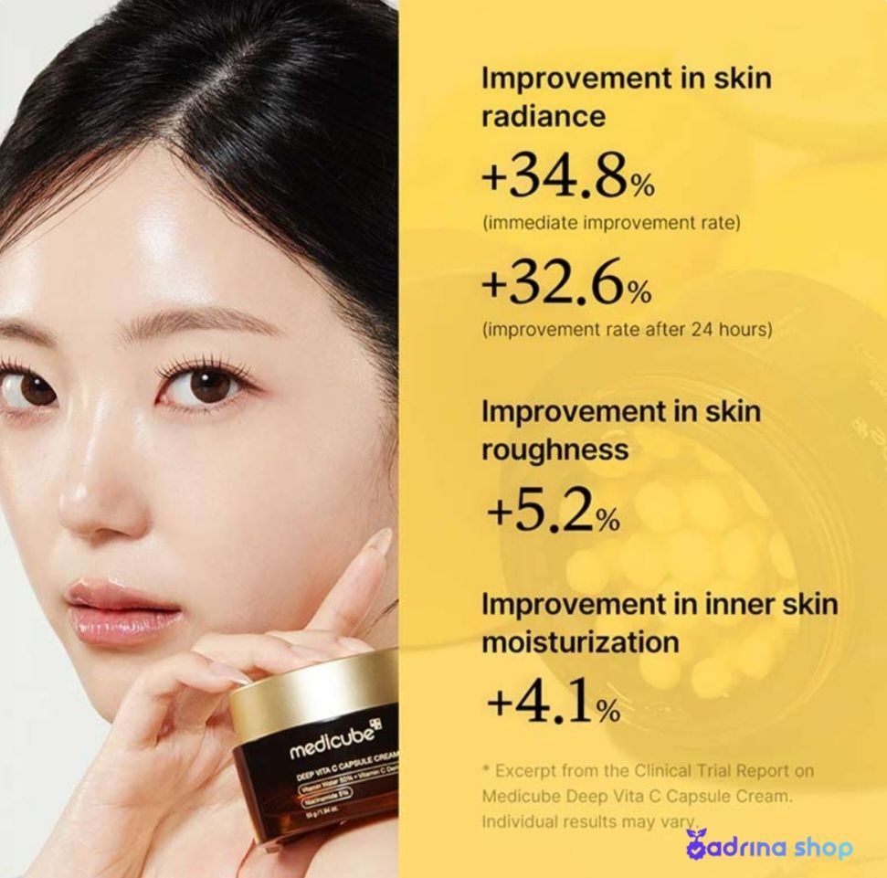 افزایش درخشندگی پوست: بر اساس آزمایشهای انجامشده، مصرفکنندگان گزارش دادهاند که بعد از یک بار استفاده از کرم کپسولی ویتامین سی مدی کیوب، درخشندگی پوستشان تا 34.8٪ افزایش یافته است.