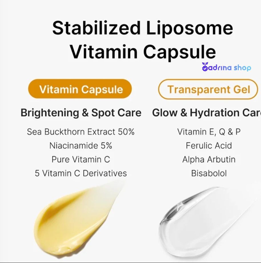فاز فعال: کپسول هایی حاوی ترکیبات ویتامین C و مشتقات آن، همراه با مواد فعال که درون لایه ای ژلی از مواد آبرسان و مرطوب کننده نگهداری میشوند. این ساختار به حفظ پایداری و اثر بخشی مواد تا زمان مصرف کمک میکند.