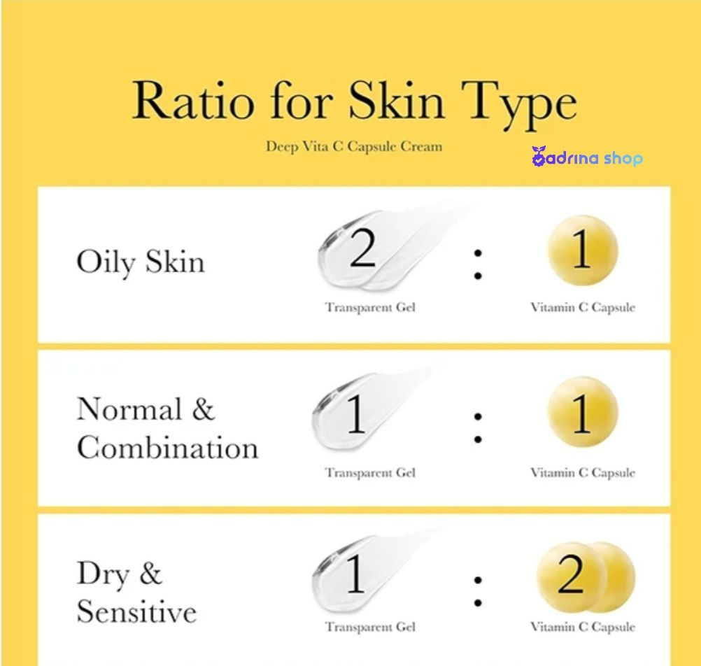 برای اثربخشی بهتر، مقداری از کرم کپسولی را با ژل شفاف محصول ترکیب کنید. میزان ژل یا کپسول را بر اساس نوع پوست خود تنظیم کنید. اگر پوست شما چرب است، از مقدار بیشتری ژل استفاده کنید و اگر پوستتان خشک است، مقدار بیشتری از کپسول را به ترکیب اضافه کنید.