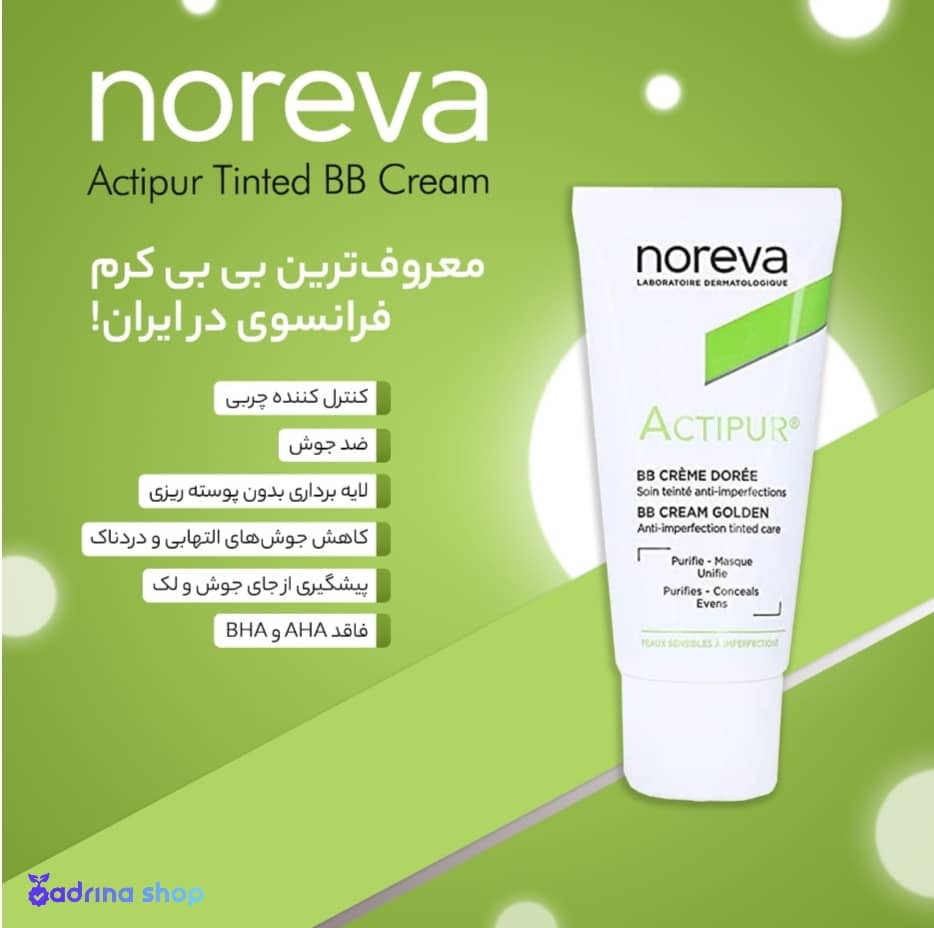 بی بی کرم اکتی پور نوروا (Noreva Actipur BB Cream) یک کرم رنگی درمانی است که برای پوستهای چرب، مختلط و مستعد آکنه طراحی شده است. این محصول علاوه بر داشتن پوشش طبیعی و یکنواخت، به درمان جوش و تنظیم ترشح چربی پوست کمک میکند. فرمول غیرکمدوژنیک این کرم باعث میشود که منافذ پوست بسته نشوند و از ایجاد جوشهای جدید جلوگیری شود.بی بی کرم ضد جوش اکتی پور نوروا ، برای سرعت بخشیدن به از بین بردن جوش ها و تنظیم ترشح سبوم ارائه شده است. ترشح چربی را کم می نماید و از تکثیر باکتری ها و ایجاد التهاب جلوگیری می کند و به حذف جوش ها و دانه های سرسیاه سرعت می بخشد. این کرم همزمان موجب درمان و پوشاندن جوش ها در پوست مستعد به آکنه می شود.