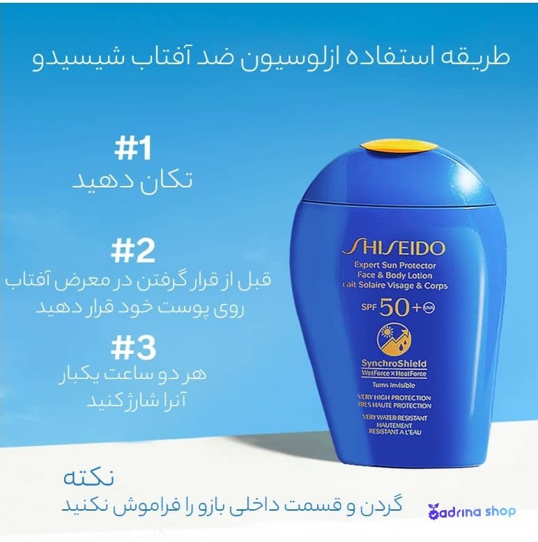 طرز استفاده از لوسیون ضد آفتاب synchro shield شیسیدو اصل :